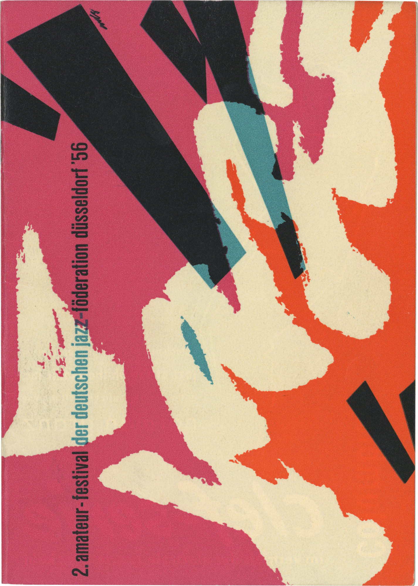 Galerie VergrößernVollbildanzeige beenden2 .Deutsches Amateur Jazz-Festival Düsseldorf 1956Jahr: 1956Medium: Brochure coverMaße: 15 x 21 cmTechnik: LetterpressAuftraggeber: Deutsche Amateur Jazz FörderationOrt: DüsseldorfDesign: Wolf D. Zimmermann