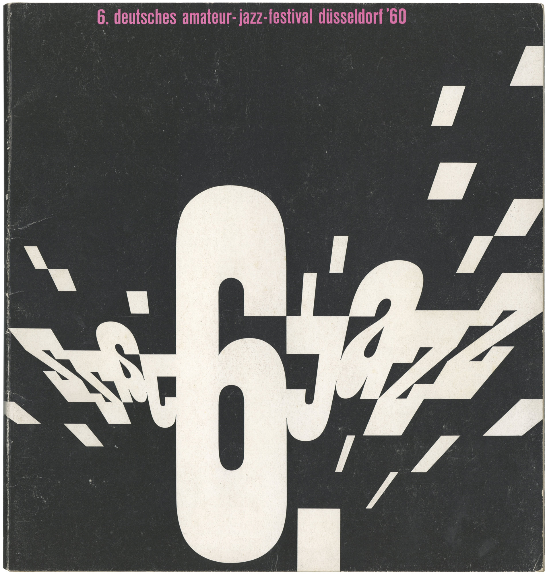 Galerie VergrößernVollbildanzeige beenden6. Deutsches Amateur Jazz-Festival Düsseldorf 1960Jahr: 1960Medium: Brochure coverMaße: 25 x 26,5 cmTechnik: LetterpressAuftraggeber: Deutsche Amateur Jazz FörderationOrt: DüsseldorfDesign: Wolf D. Zimmermann