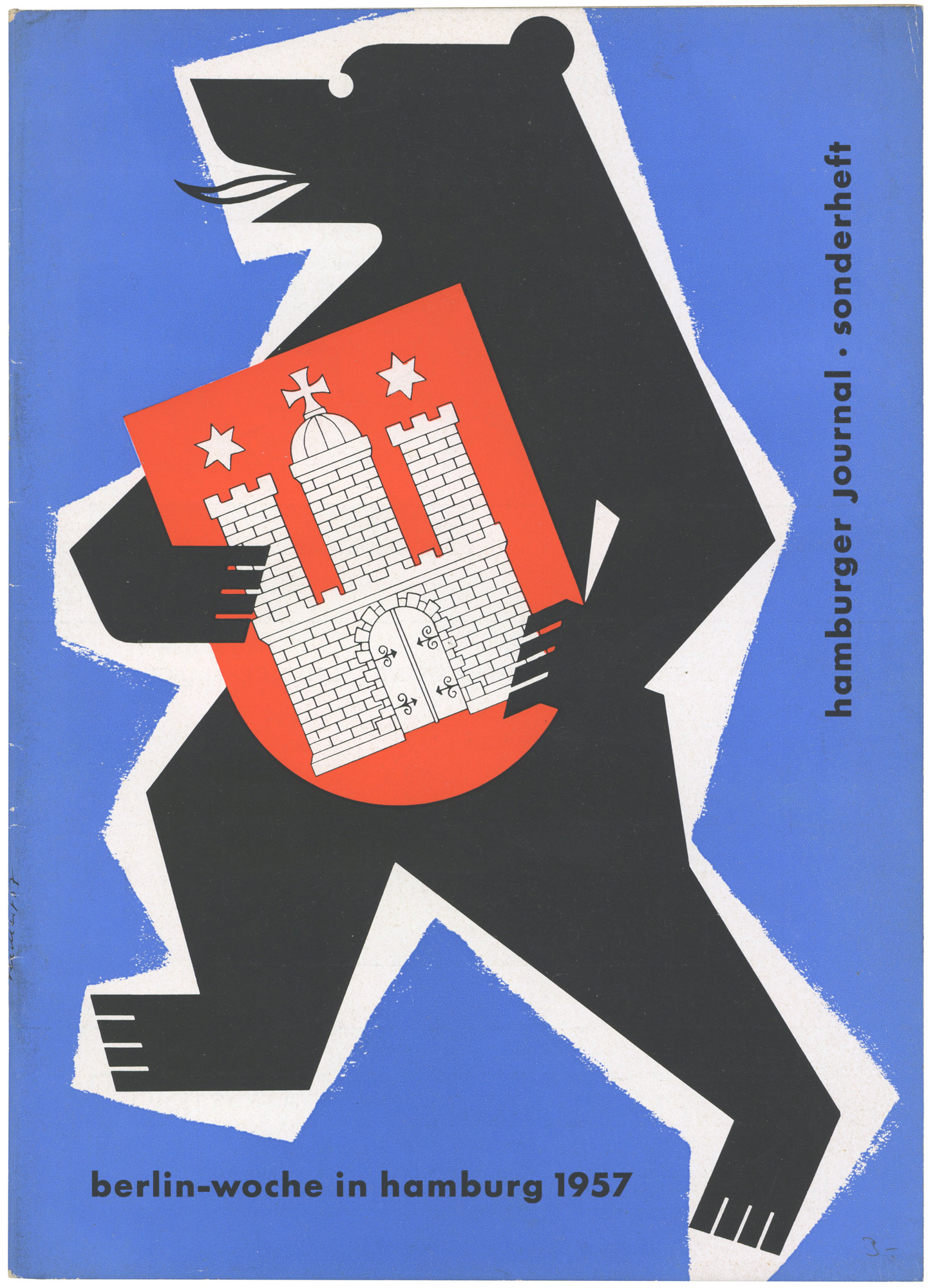 Galerie VergrößernVollbildanzeige beendenBerlin-Woche in Hamburg 1957. Hamburger Journal SonderheftJahr: 1957Medium: Magazine coverMaße: 21 x 29 cmTechnik: LetterpressAuftraggeber: Hamburger JournalOrt: Hamburg, BerlinDesign: Bernd G. Reichert