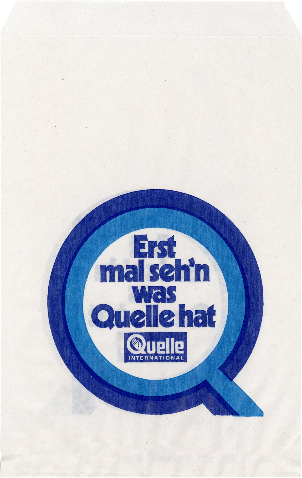 Galerie VergrößernVollbildanzeige beendenErst mal sehen was Quelle hatJahr: 1970Medium: Paper bagMaße: 13,5 x 21 cmTechnik: LetterpressAuftraggeber: Quelle VersandhandelOrt: NurembergKeine Beschreibung