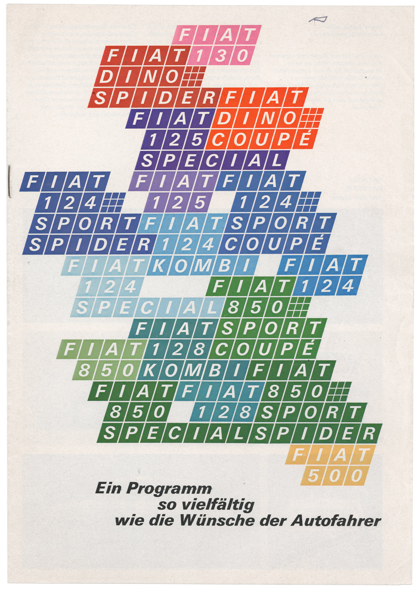Galerie VergrößernVollbildanzeige beendenFiat. Ein Programm so vielfältig …Jahr: 1967Medium: Brochure coverMaße: 21 x 30 cmTechnik: Gravure printingAuftraggeber: FiatOrt: BaselDesign: Armin Vogt, Jean Reiwald Werbeagentur (Basel)