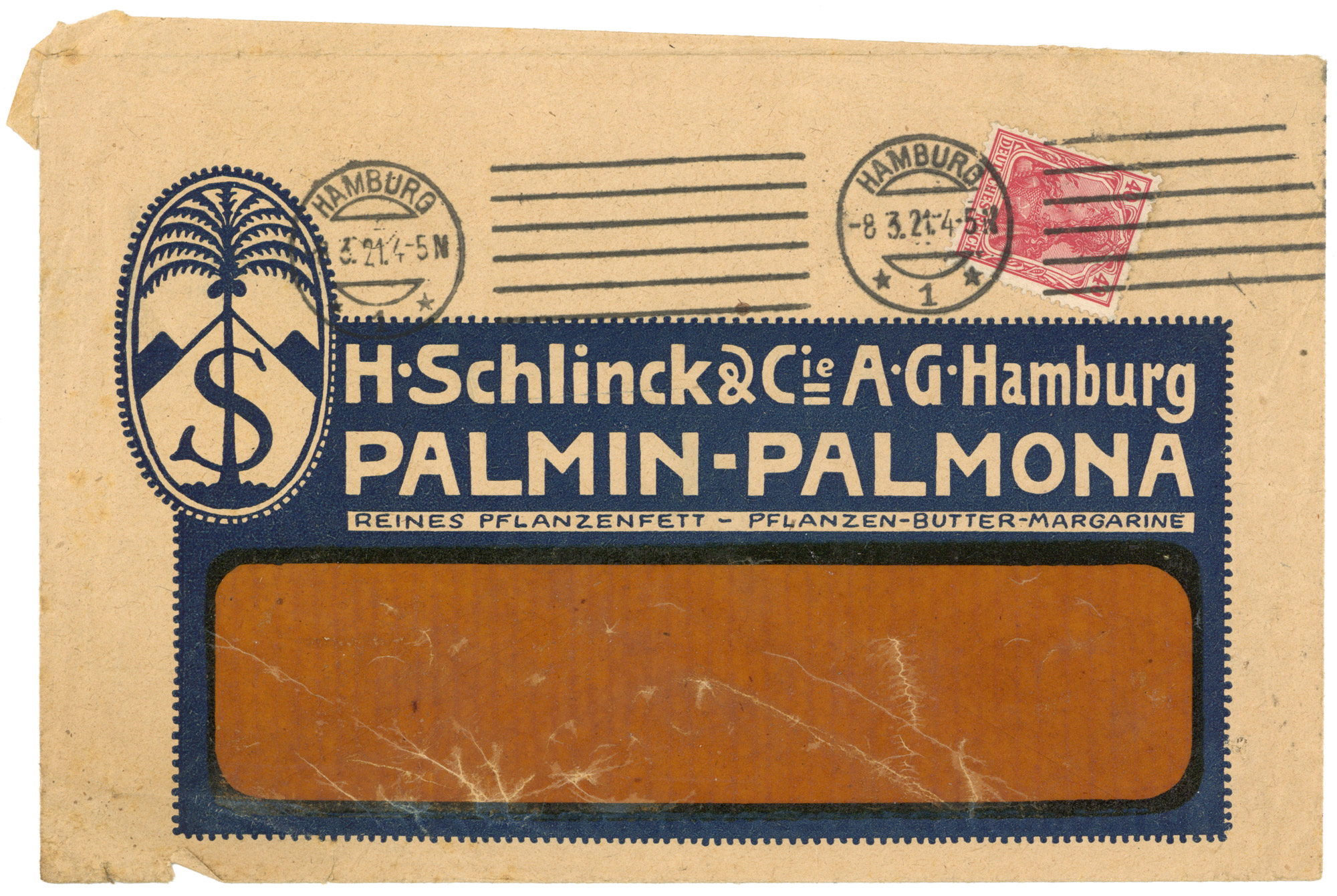 Galerie VergrößernVollbildanzeige beendenPalmin-Paloma [Envelope]Jahr: 1912Medium: EnvelopeMaße: 18 x 12 cmTechnik: LetterpressAuftraggeber: H. Schlinck & Cie AGOrt: HamburgKeine Beschreibung